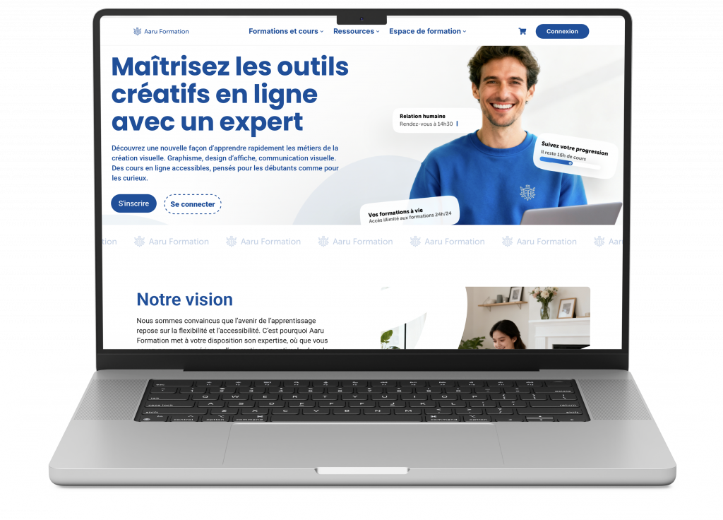 Aaru Formation est une plateforme en ligne dédiée à l’apprentissage des logiciels de conception graphique pour les débutants. À travers ce projet, j’ai conçu l’ensemble de l’identité de la marque : la charte graphique, le site web, les réseaux sociaux, ainsi que les contenus de formation.